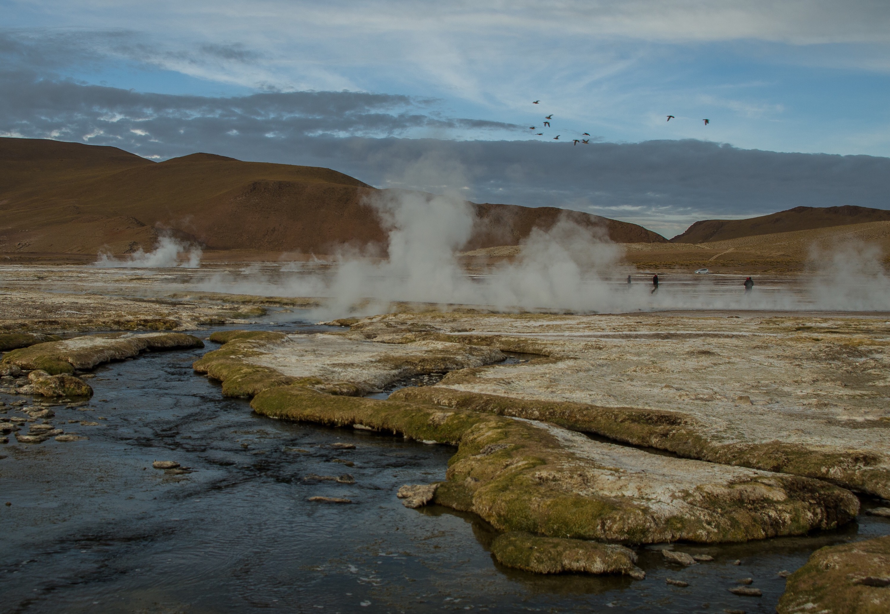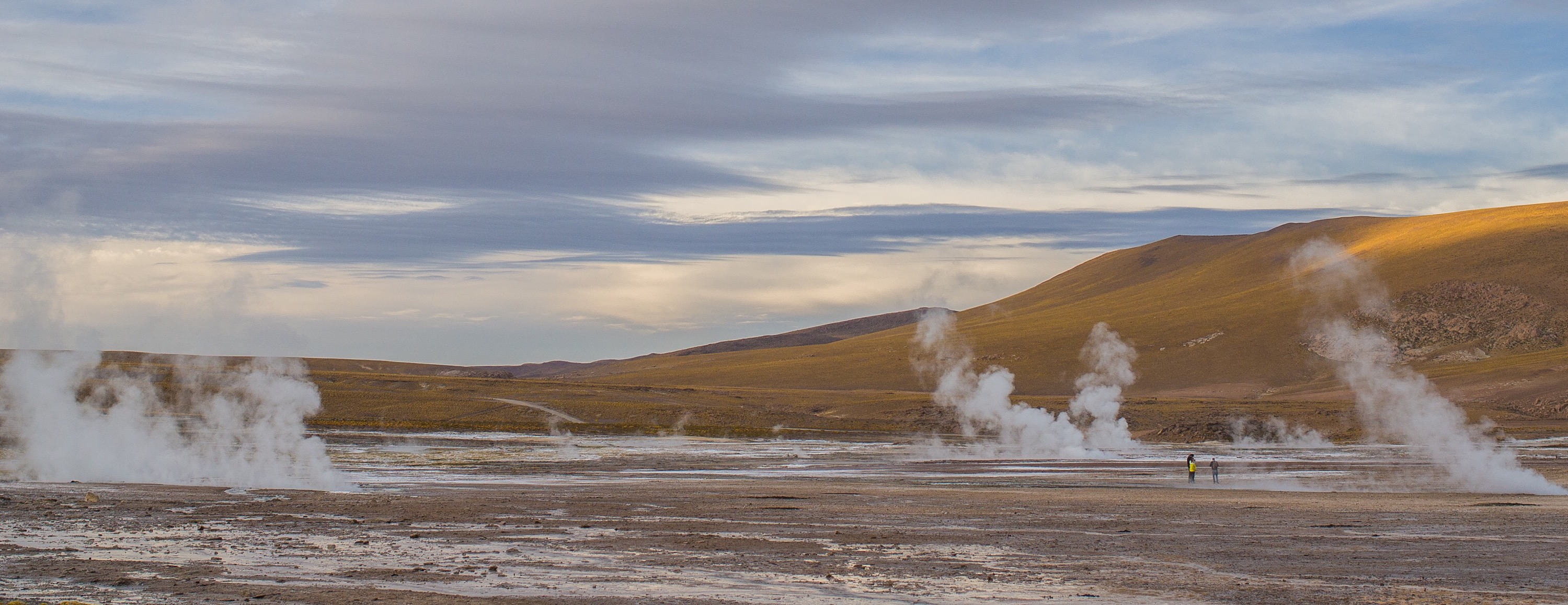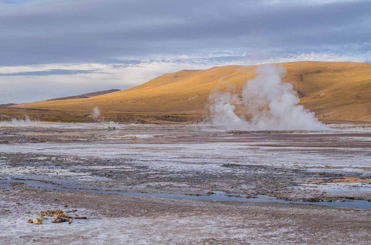 Dawn threatens but the sun remains hidden as a scarred pan of barren bleached land emerges. Everywhere in this desolate space funnels of steam arise from nowhere to cast the vista into an eerie mist, we’re here. It occurs to me that I’ve never actually seen geysers up close; never swum in an open air natural hot spring either so it looks like we’ll be ticking few ‘first ever’ boxes today. The first thing that strikes me is the size of the space here, the geysers take up pretty much the entirety of a small valley, a welcome relief against the convoy of busses we made the journey with. Even though there’s heaps of people here a huge number hover around a single large geyser like penguins huddling against the cold, who knows why but they do. Thankfully for us that means that we can venture off feeling relatively unbothered by the hordes we’d feared.