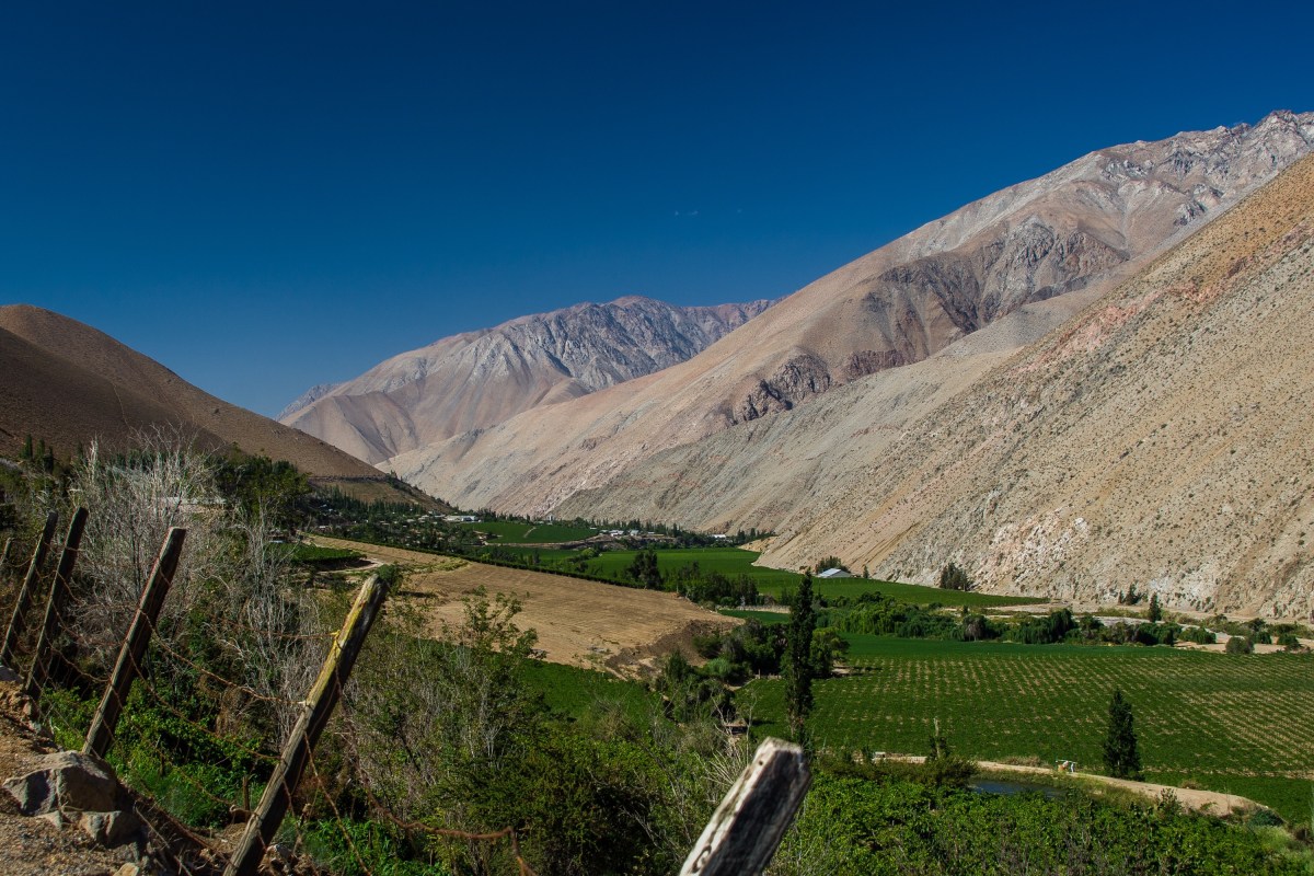 But back to the alcohol, Chiles favourite. We score a random bus and we’re off for the roughly two hour trip to the Elqui Valley. Entering the valley we begin to see grape vines, that familiar feeling of elegant rural romance a welcome assault. Pisco grapes are grown slightly differently here, trestled up quite high and forming a canopy unlike the rows of wine grapes; we keenly soak up every detail we can see. Past a dam the valley narrows, the mountains rise, the trees thin and the linear pitches of lush green vine plots take charge of the vistas before us like a green river winding through the valley. The landscape here is still very dry and desert like lending a stark contrast between the valley floors lush green and the imposing harsh mountains that rear up either side.