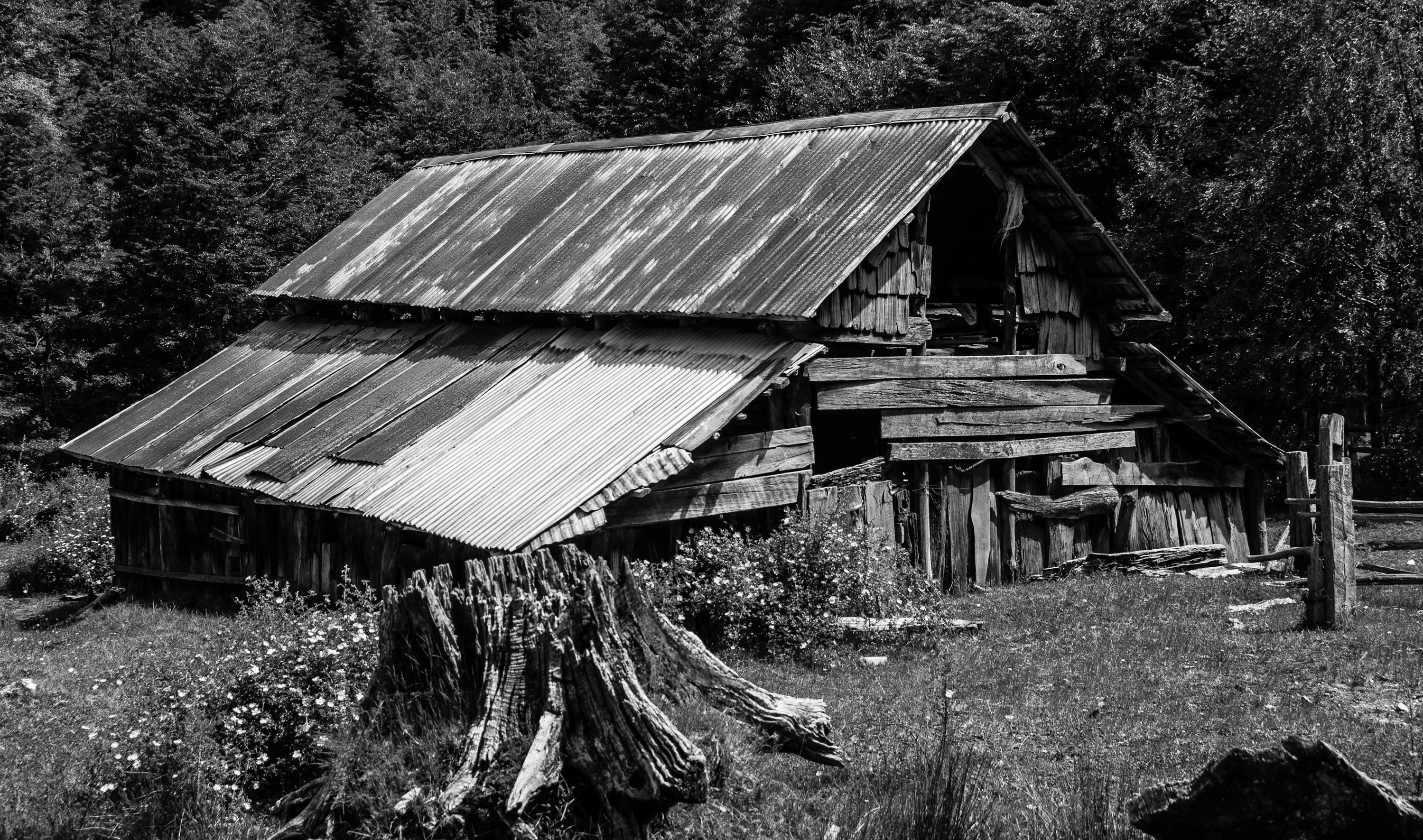 But before long we begin our descent again farewelling the domain of the big trees and exiting the confines of the park borders. Tall straight trees dominate our vistas still albeit not quite like in the upper regions yet it’s worth the occasional stop-and-look all the same. Down and down we go through ever evolving landscape, it seems to change every ten minutes or so. Outside of the park boundary the relatively limited range or flora gives way to a wider range of introduced plants, or should I say weeds. The weeds are guiltily a little nice I have to say, the forest stops and we are in a relatively open field littered with wild rose. With two old farm buildings long since left to ruin it’s clear that ready human activity in this space is a notion long forgotten. The expression ‘beaten track’ comes to mind, here the track is not beaten any longer, nature has reclaimed the fight.
