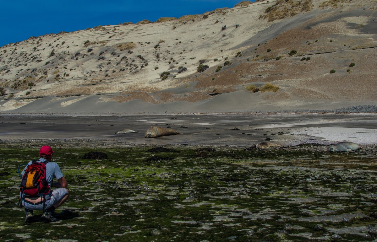 Finally we reach the ocean and the benefits of a private guide reveal themselves in the form of: jumping over roped off paths and past ‘no entry’ signs, seems we’re getting the locals pass. We’re on a headland in the blustery warm breeze coming from the west looking distantly down to some Elephant Seals far below, nice to see but not exactly an immersive experience yet none of us voice disappointment. Soon enough however we’re stepping over a small fence and plunging down a rough path to the beach, the viewing platform seeming more like a practical joke. We arrive to a beach littered with Elephant Seals baking motionlessly in the sun embodying indulgent laziness like it’s a sport.