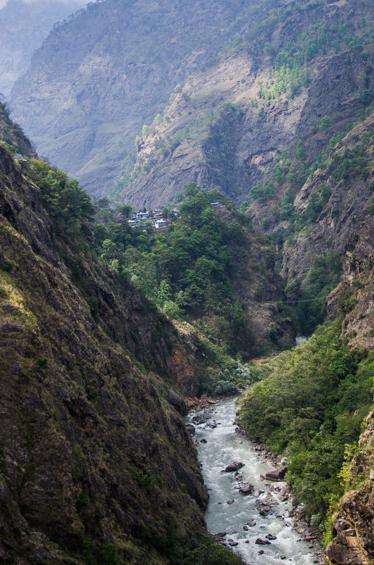 Four hours of hiking brings us to a kani at the crest of a small rise and beyond an open flat pan that holds the town of Tal. A kani is essentially a buddhist archway with three shrines at the top to cleanse the spirits of those that walk through. Through the kani, spirits cleansed, the river opens up to a flat pan straddled by the town of Tal, quaintness set amongst severity that is starting to become the theme here. Through the town of people politely asking us to stop we eventually settle in a small family home of gaudy bright colours that are the fashion for any Nepali with the means to make it so. Soup and momo’s go down a treat but in no time we must move on, a nearly perfectly vertical wall has laid ahead of us for some time now, a precipice abutting the river that exemplifies the drama and severity of this place. we can’t take our eyes off it.