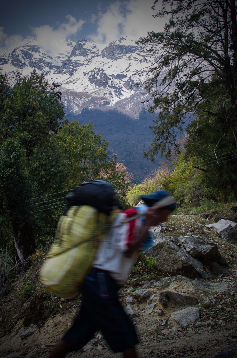 Spurred on by the sight of a real Himalayan giant we surge forward fuelled by a drive we have lacked thus far, the annoyance of the vehicle road is fading day by day as nature takes a gradual hold of its domain the higher we walk. Catching up with the crowds of hikers that skip the destruction below we’re in a greater crowd to accompany the slowly revealing greatness of this place. There’s a bunch of crosses marked over side tracks to give us reason for pause, we think they’re the old track that we would like to be on but we’re hesitant to possibly walk into someones home uninvited. Problem solved, a few porters from another group don’t take a second look and veer off the road up the seemingly forbidden path.