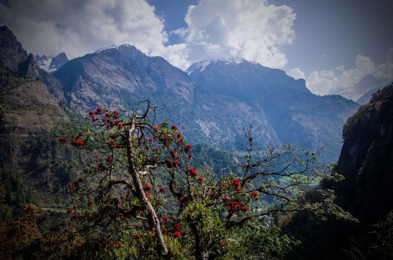We cross the road at times only to divert straight off it again in no time, at every juncture we’re choosing the forbidding cross rather than the inviting arrow. It defies belief, we wonder why we are being directed onto this road? If Annapurna is drip feeding us encouragement it’s doing a good job of it, we come to our first Rhododendron, part of the reason to come here at this time of year. With a heap of ‘Rhodies’ in our garden the sight of them here where they come from is quite a highlight, the telltale downward turned leaves are crowned by trusses of bright red flowers to set off a backdrop of mountainous immensity, beauty and the beast in Himalayan scale.