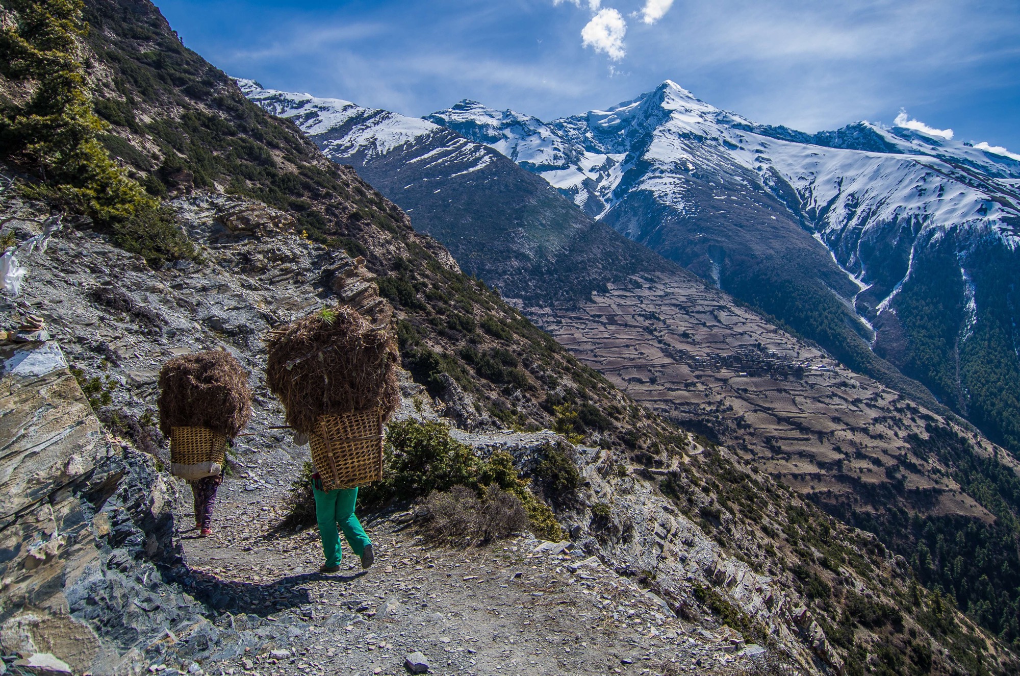 Carrying pine needles back to the village, enroute to Braga, Annapurna, Nepal