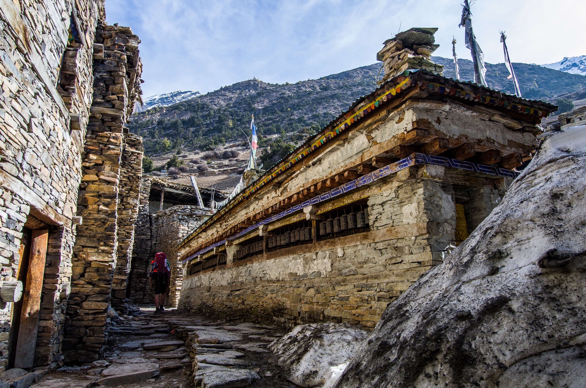 Steve walking past Gyaru’s prayer wheel wall, Annapurna circuit, Nepal