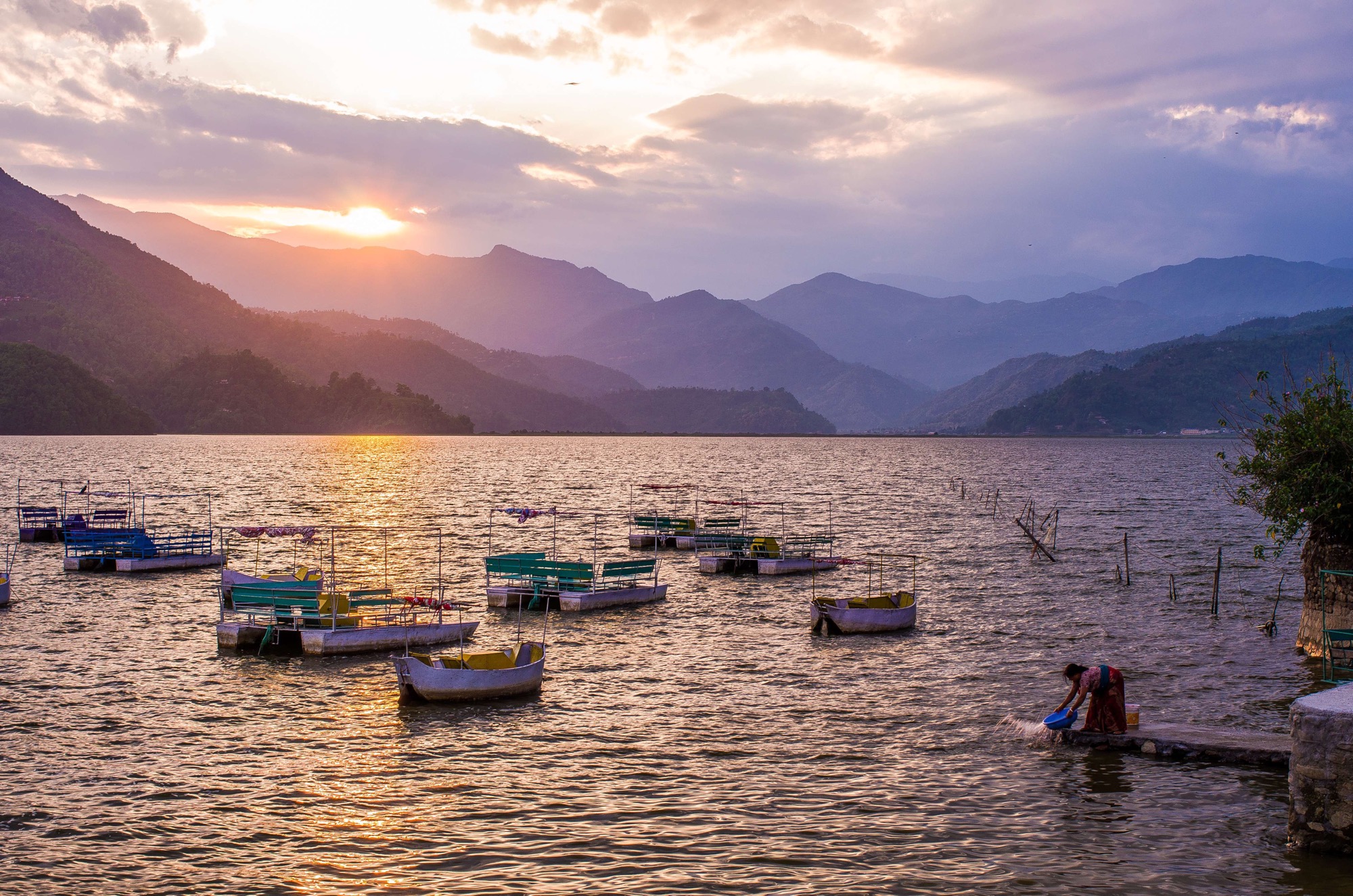 Clothes washing at sunset, Fewa lake, Pokhara, Nepal