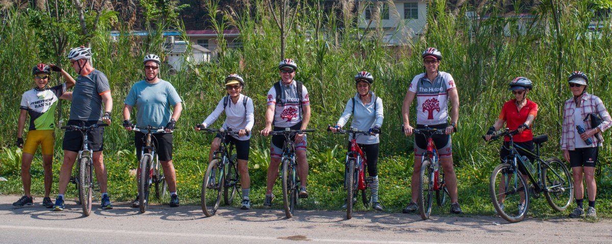 But enough of the light and fluffy stuff, the serious business of the cycling mission is about to begin as we journey through the countryside learning about tea and whatever else comes our way. Cadel Evans can have his Tour de France team Orica Green Edge, the other big Aussie team on the international circuit is the soon to be famous Yunnan Green Tea Edge, watch this space cycling public. Driven through the tacky city of Jinghong to the starting point with our two support vehicles and team motor bike no less the epic begins in the warm sun of a Chinese heat wave. Two mates of ours, Andy and Guy join Charlie’s mum Janno and three of her friends Robbie, Philipa and Sue as the most motley crew to ever squeeze into bike pants. A staggered start sees us lead off as the four grannies and the four gays start the 59km day-1 under the new collective as the Yunnan G8. One wonders, through several hundred kilometres of senior moments, princess fits and inevitable high drama; what folly of blind fortune is going to bring us all back to Jinghong in one piece?