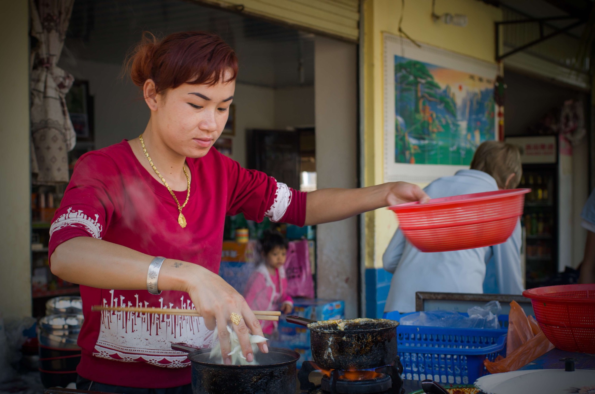 Disaster strikes suddenly, our chances of victory in the Tour de Yunnan are dealt a sever blow with Charlie waking with a deathly pale visage after a horrid night running to the toilet. A tummy bug is a wretched thing at the best of times without being stuck in a foreign bed having to tiptoe past everyone to go outside, down a flight of stairs to a squat toilet. Safe to say that Charlie didn’t chalk up the best nights sleep ever, so one distinguished member of the team is in the bus for the 46km day 2. Before a peddle can be pushed though it’s food time, the recurring theme of abundant food looms as the most welcome problem we might possibly have this trip. A village noodle stall is to provide our energy for this morning of Le Tour.