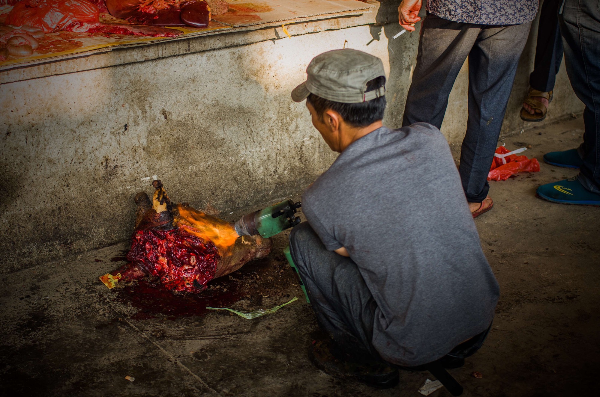 Rows and rows of fruit and vegetables form a colourful gallery either side of the entry as we commit to the market, this cramped informal passage into the throng doesn’t scream of an easy reverse, no going back now. But why would we want to, as Echo says: T.I.C: this is China. To compliment the freshness of the fruit and veg a deeper voyage into the market reveals fresh meat; literally. Huge slabs of all parts of every animal are laid out on large tables with the ever sanitary corrugated cardboard to soak up the juices and hold them at room temperature, delightful. It’s no wonder we’ve all taken turns at getting sick on this trip, safe to say that food hygiene messaging isn’t a big focus in rural China. Past a man using a whopper of a blowtorch on a disarmingly intact pigs head, sans body, and a woman carving huge ribs into sections with a double handed cleaver more like a broadsword it’s enough to turn one vegetarian; almost. Time for noodles, might go the pork this time.