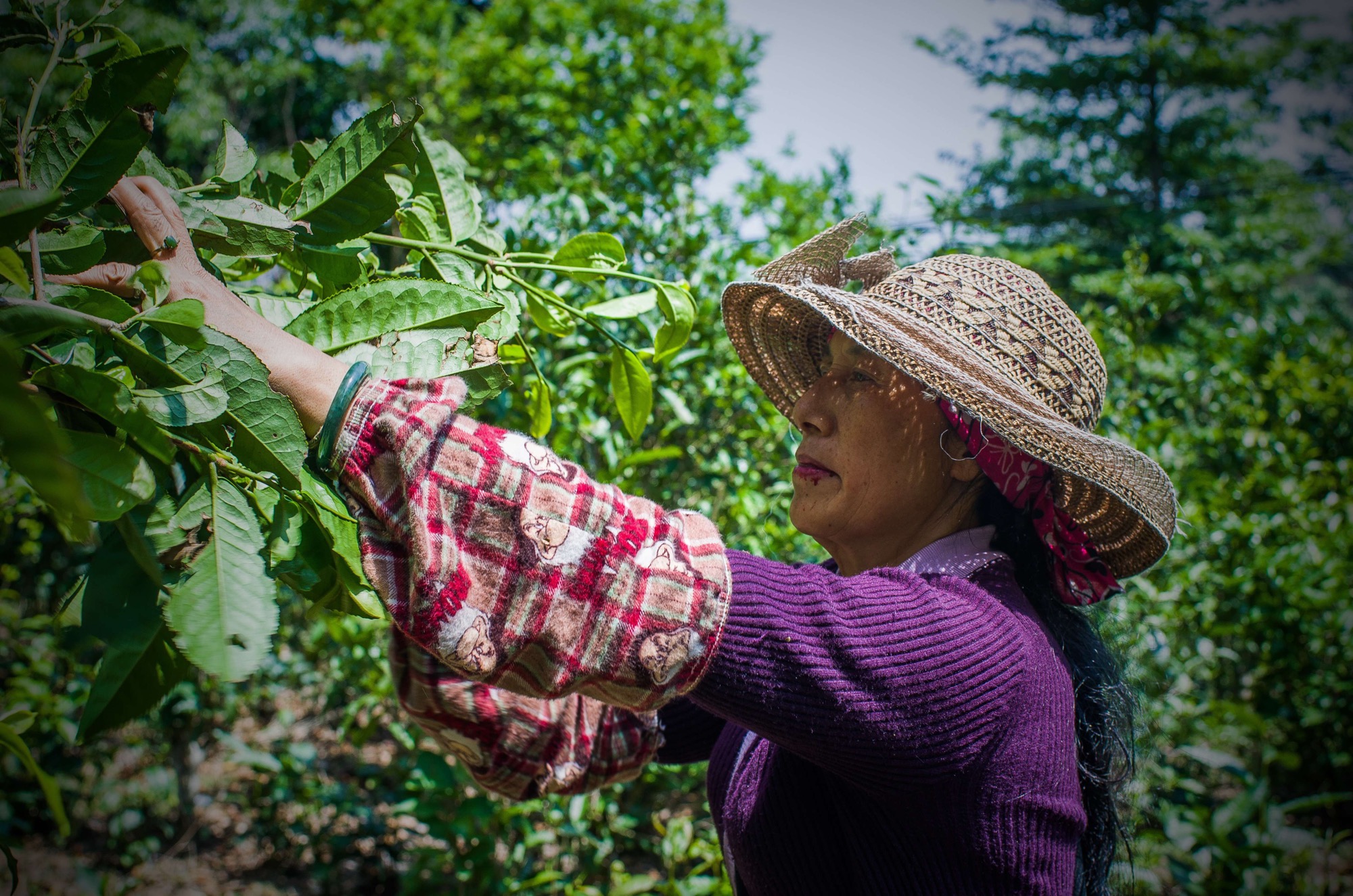 Ms Li demonstrating how to pick tea. Yunnan province, China