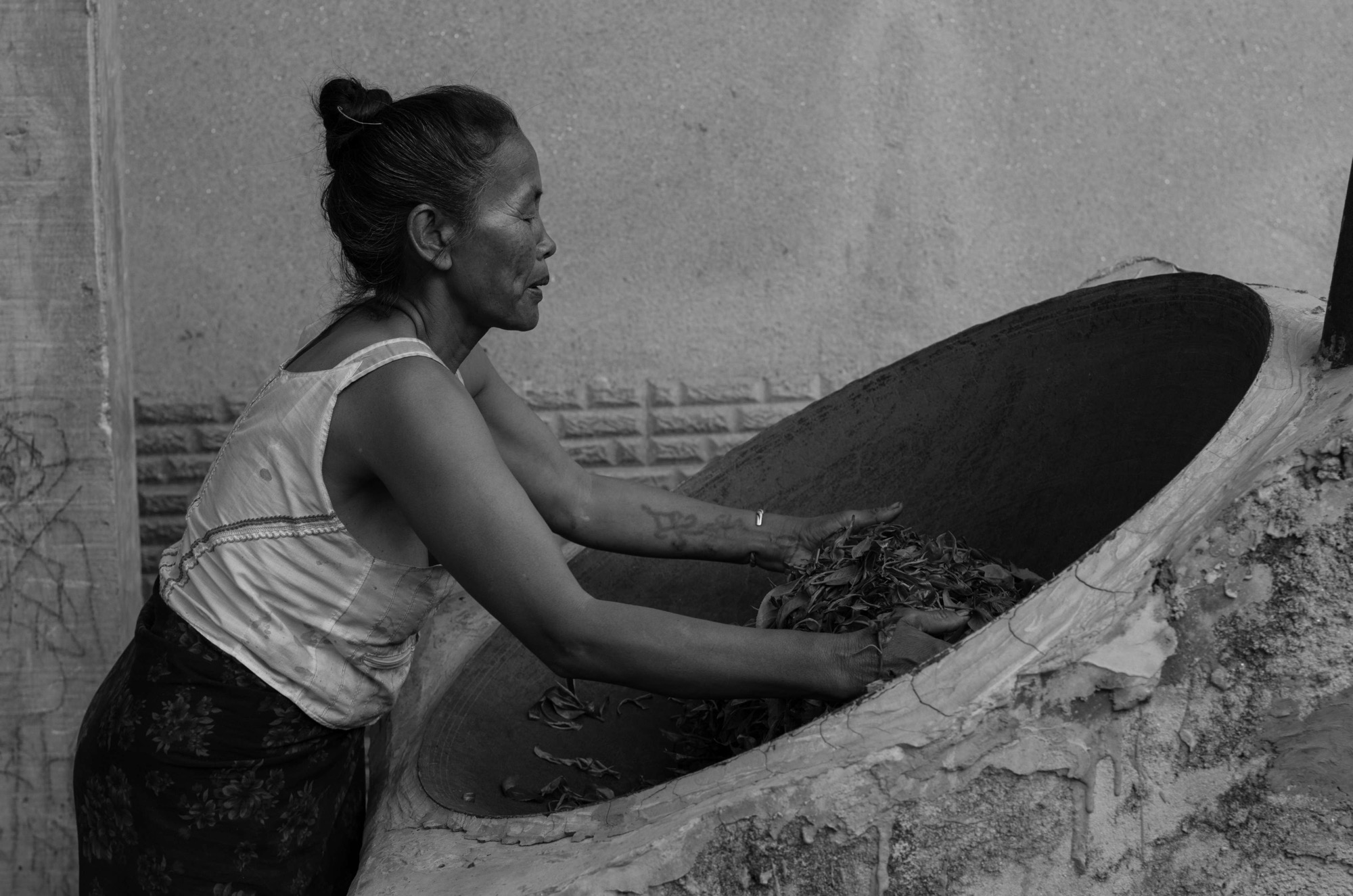 Lady of the homestay who was cooking tea leaves after picking all day. Yunnan province, China
