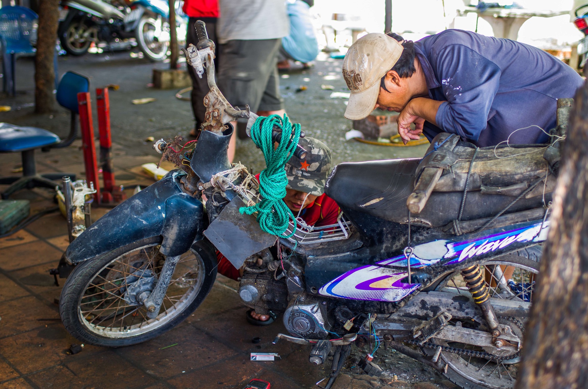 We find our mechanic by chance more than anything as street numbers in Vietnam seem more like a lottery draw than any sequence of reason, 401 should be beside 35; makes total sense right? We win lotto though and find him smothered in grease and happy disposition, like the rest of this industrious culture he cheerily declares half an hour for two oil changes and changing the rear suspension on my bike. That was alarmingly easy. Main chore seemingly sorted it’s time for the serious business, market time for clothing that can keep out the sun followed by coffee and food. Who are we kidding, food and coffee come first.