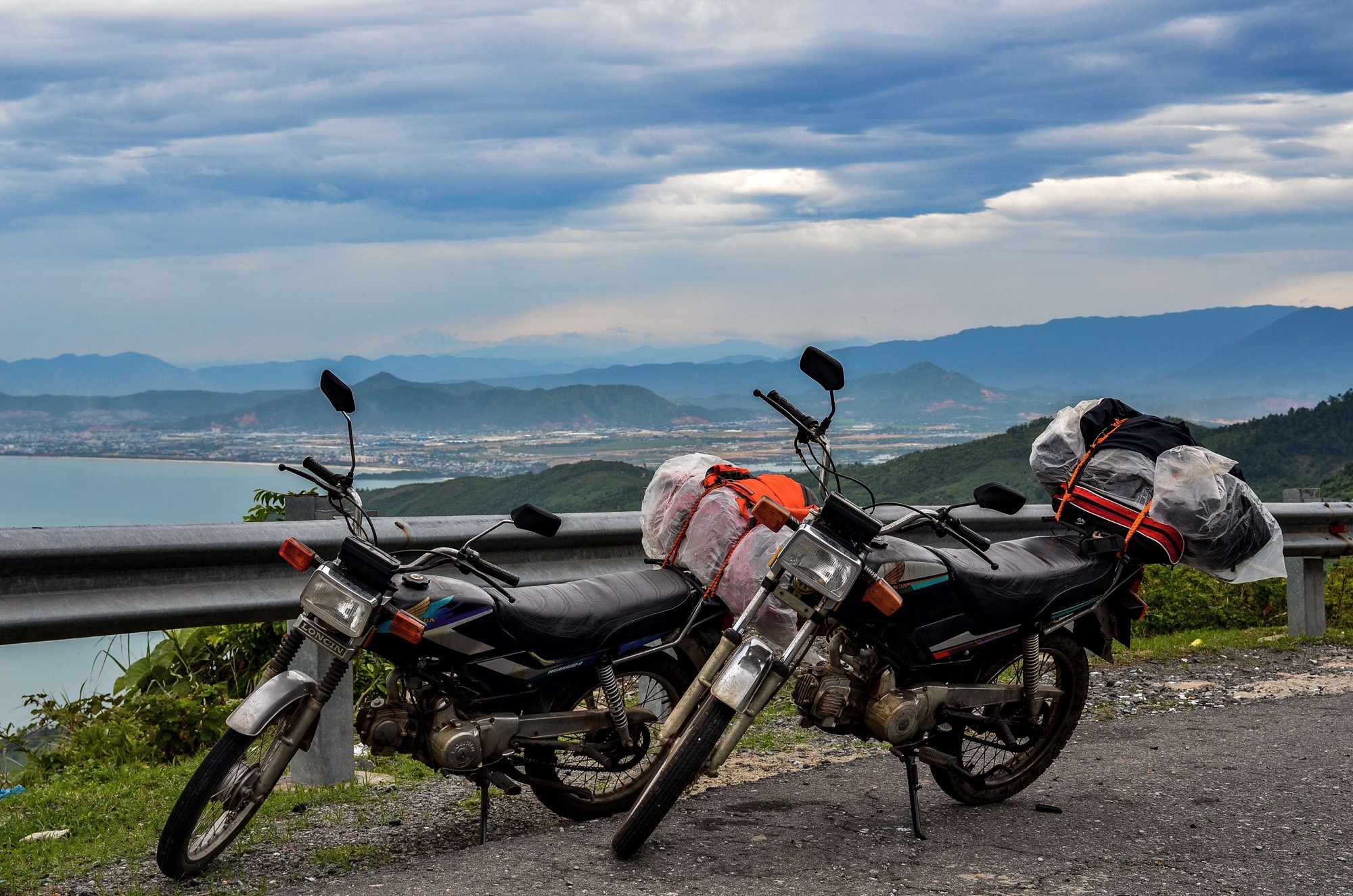 Could anything more possibly go wrong? Oddly enough the greatest attention seeker of them all, Rob, is stoic and irrepressible today, he’s leaking oil which is a concern but we cannot fault his endeavour as all others fall around him. In an odd twist the pouring rain is the least of our worries and for the first time today we make good progress through towering mountains, raging waterfalls and sweeping vistas of lush tropical jungle. We so often associate mountains with aggressive rocky crags, snowy caps and frosty wind but here in Vietnam the immensity, grandeur and intimidation exists without the usual markers. We’re chasing time that seems too far away, Ari who is learning to ride a bike on this trip is battling with rain, Vietnamese roads, Vietnamese traffic and soldiering on only slightly slower than the rest of us who have lifetimes of biking experience behind us. Today is a team effort and we will make it, we must.Finally we make some progress, it’s nearly 4pm and although a good leg of spectacular scenery lies behind us there’s still over 100km to go and the bikes need a rest. Rob is leaking oil while Greg and Cat Lady are still going well in the lightened rain. We only pray that the rain stays away as we still don’t know if the issue was the carburettor or water related leaving us riding on eggshells. Hurdle after hurdle has been placed before us but outright disaster has not visited as we resign to arriving in the dark, a terrifying prospect but our resolve to reach Hoi An today is not abandoned so easily.