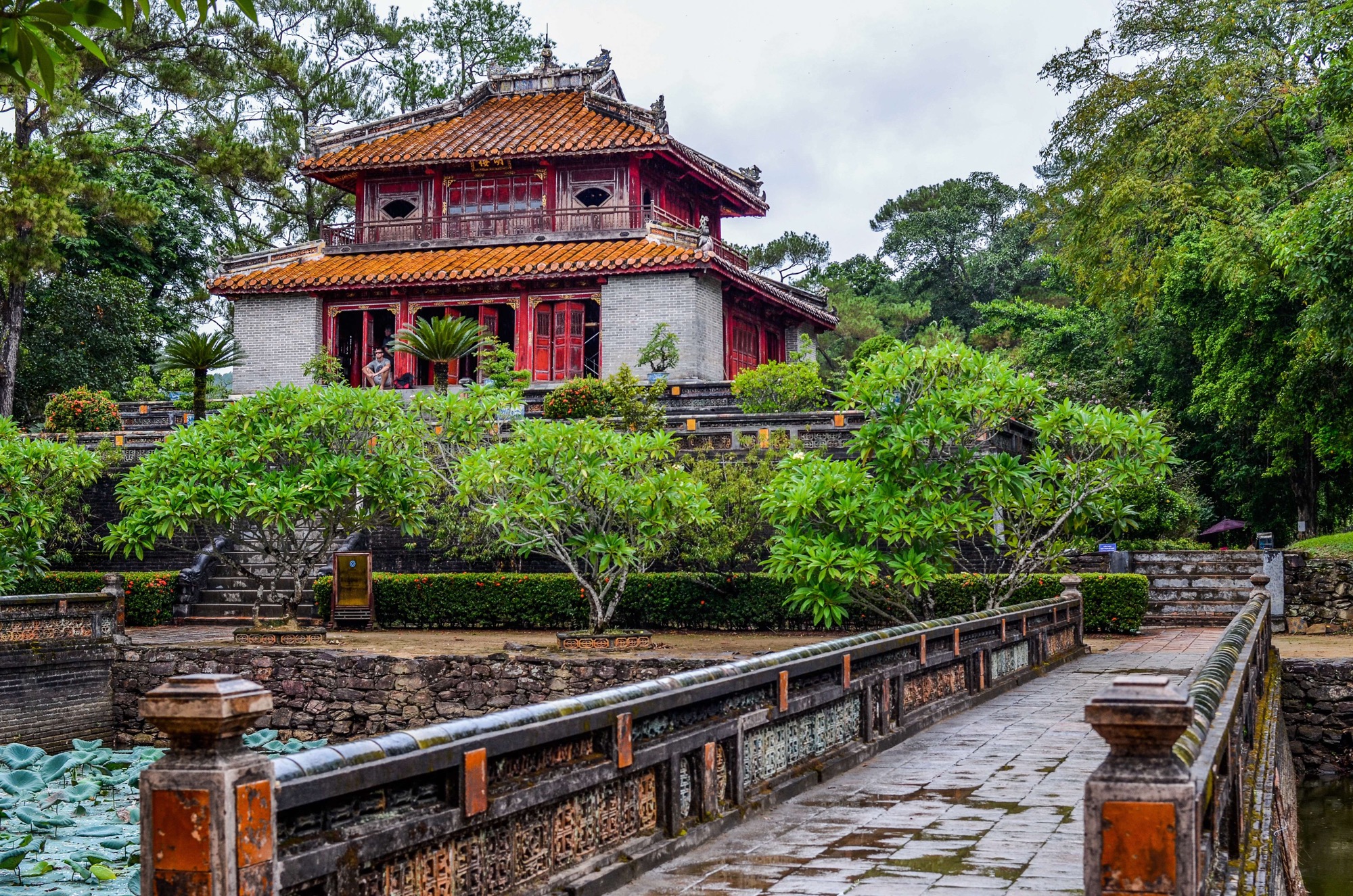 Today we’re seeing dead people, we’re off to another tomb which essentially means an intimidating arrangement of structures to inspire reverence and awe. On much larger grounds the tomb of Minh Mang is more show garden or expensive golf course than the single mindedly intimidation of Khai Dinh. Through pagodas all lined into a straight walk of grandeur we similarly pay our penance but this time it’s beauty and grace in place of stern foreboding. Where Khai Dinh has a life sized bronze statue cast in France atop his burial tomb Minh Mang’s promenade ends only in a wall three metres high and about 100m in a perfect circle atop a gentle rise. He’s buried in a small underground palace behind those walls entered only by a subterranean passageway that has now been sealed. I wonder if the representations of these respective tombs reflect the lives of the men inside?There’s only so many dead people we can see in one day, it’s back to Hue we go, or attempt to go. I’m not a violent man, I’m really not I promise. But every person has a breaking point and Greg is pretty close to guaranteeing me a successful defence of temporary insanity for the violence that’s about to happen. It’s back to the mechanic once again. Every second mechanic in Vietnam has had a go at this big sulking cow and no one has been able to make him moo, or has he just got that many issues to deal with? One problem gets solved, I’m not willing to say we’re in the clear anymore and with a whole lot less petrol channeling through the carburettor we’re purring again. But for how long?