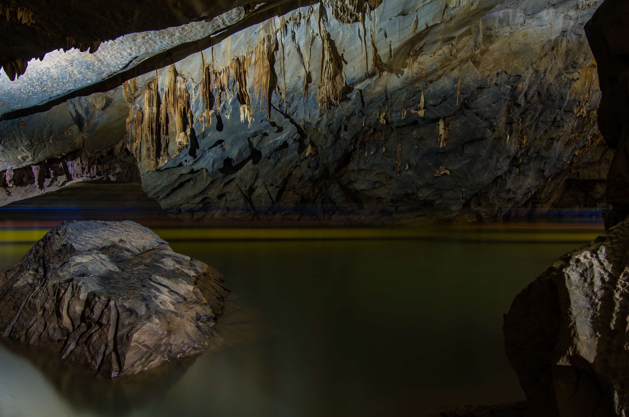 Rounding a bend in the river we stare in the face of a rock wall, vertical and severe even with the gentle hue of faint blue lending it a passivity its immensity contradicts. Our river that supports a world around it is no trickle in the mud and yet it channels directly to this sheer rock wall, and through it. Edging closer the engine is cut and we’re cast into silence, our smooth slip on the water just got smoother. The stone cliff persists, it’s not a trick, our river continues it’s slow meander into a gaping maw at the base of a stone wall that isn’t as foreboding after all. The lady guiding us today makes her way to the front of the boat and with a single oar lashed to the boat sways in rhythmic time to paddle us in silence into the darkness before us.