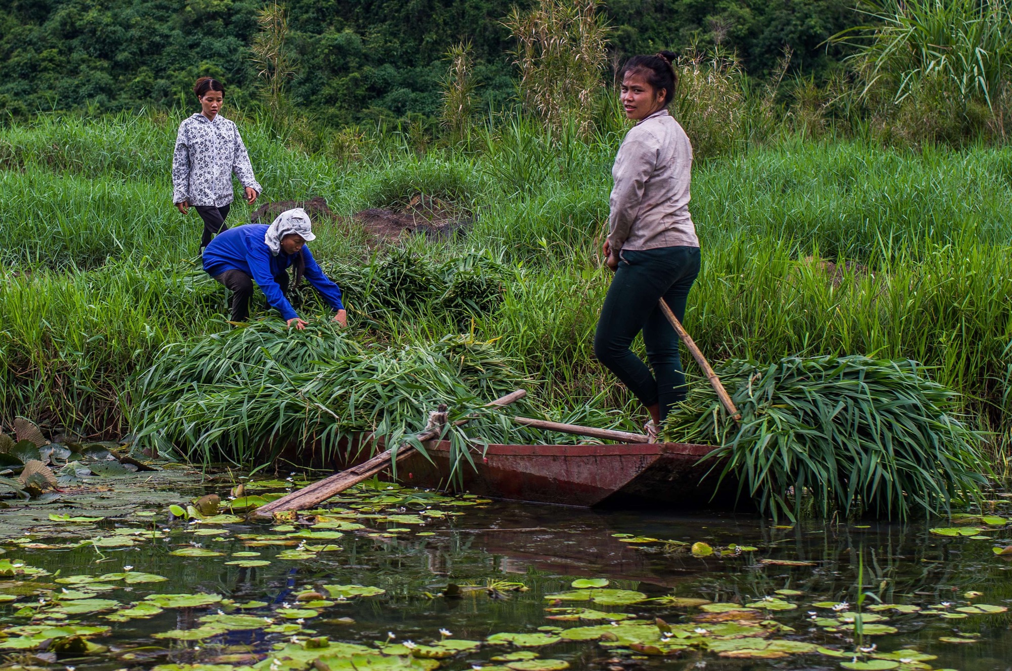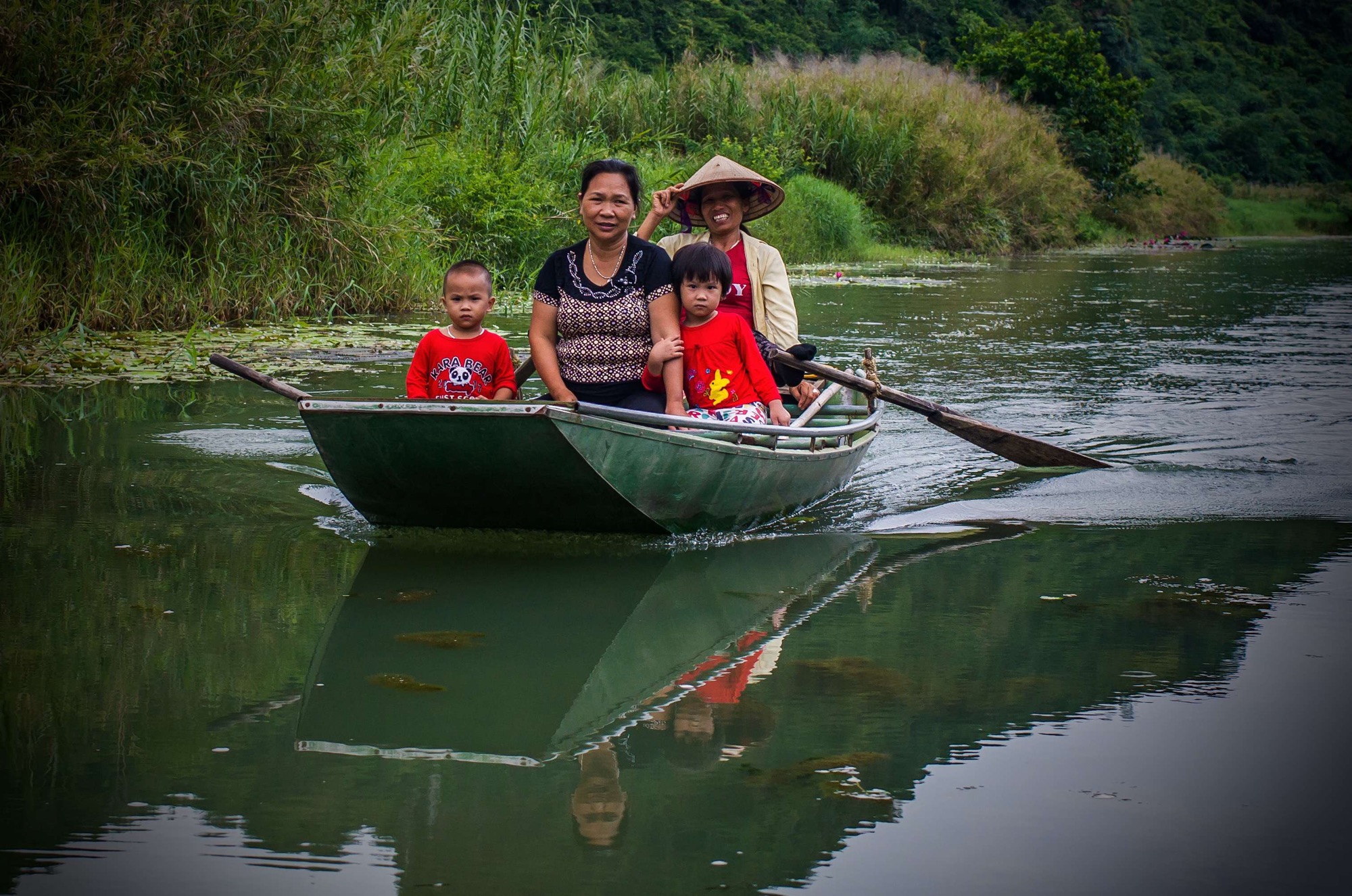 In no time there’s what appears to be a husband and wife team looking into Rob, pulling off parts with lot of puzzling noises coming from Rob and the pair alike. Engine back on, start him up but the noise persists. More noises ensue. Again Rob is operated upon, and this time there’s no hoping or guessing, a few large chunks of something are pulled from the engine, torn and split into rubble. Seeing the broken fragments of engine parts on the floor it’s hard to imagine how Rob made it yesterday, it looks like we were just a loud crunch away from a catastrophic engine failure at any moment. It could have been bad, but it wasn’t, we leave thanking ourselves for our stroke of good luck near the end of this ride in which we’ve had plenty of the other kind of luck.Coffee comes and goes so with good bikes, new oil, caffeine and food we’re off for a bit of sightseeing, a lazy boat trip should do the trick. The mountains here are similar to those in Phong Nha, solitary mounds of drastic shape emerge from an otherwise flat landscape in contrasting drama. We board our boat and in no time we’re being paddled into the silence of a cave and out the other side of one of the small aggressive mountains. This slow river winds through picturesque scenery dotted with lilies, lapping gently to the reeds and bamboo that grow densely up to the bank and all the while there’s silence broken only by the rhythmic shuffle and swoosh of oars cutting the water. Gone are the screaming engines, the relentless honking horns and ingrained need for concentration of yesterday, today we have nothing to think about beyond observing something beautiful.