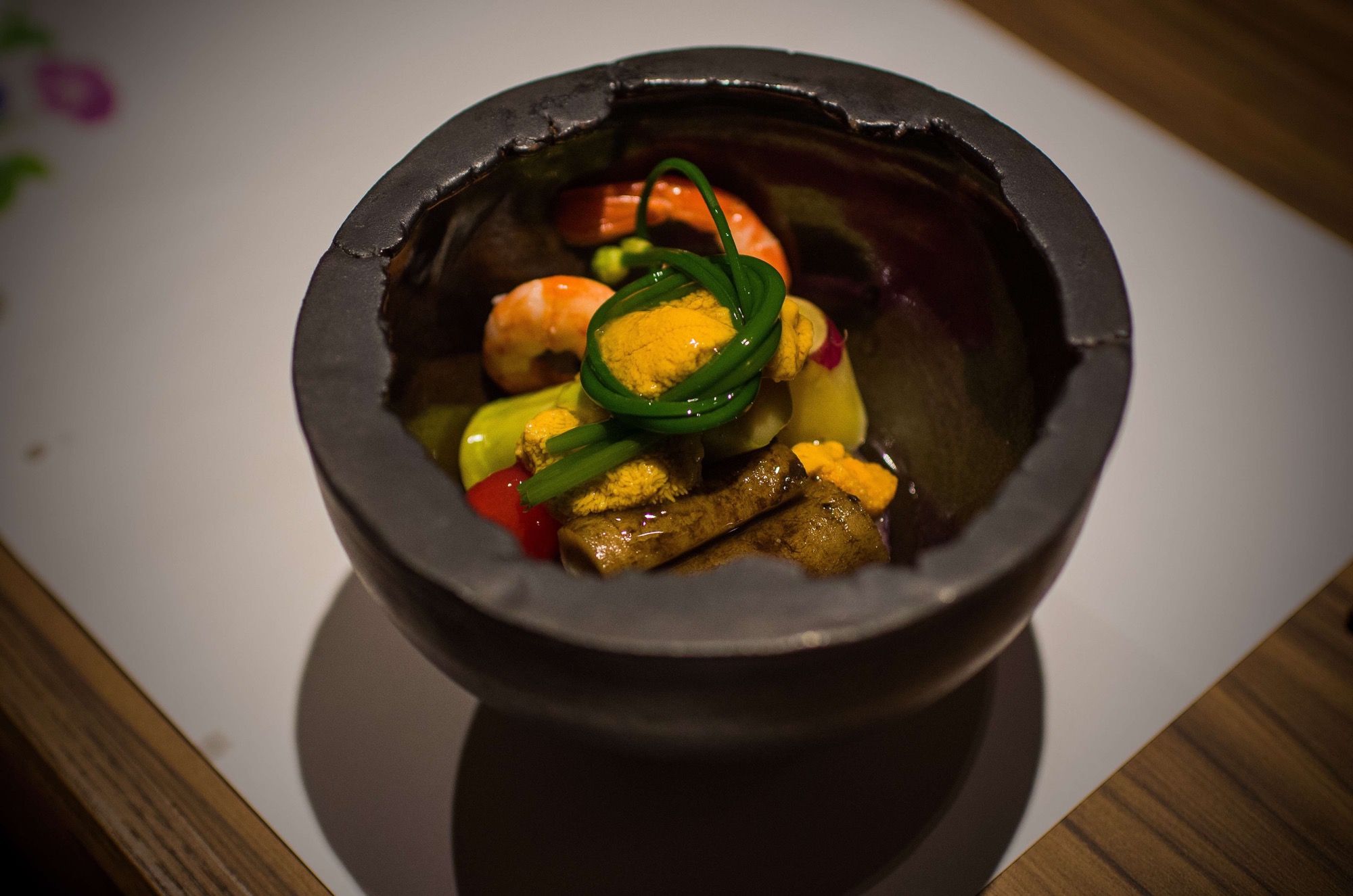 This is all too much, I need a bathroom but disaster strikes, I’m confronted by an array of buttons with no English; what if I press the wrong one? A few false starts send jets of water in curious directions but thankfully there’s no indoor fountain before eventually the relieving flush. Now it’s not only Aki feeling nervous. But the embarrassed nerves are mine alone and don’t last as we flow through course after course of evoked sensation rather than just flavour. We often sit in restaurants chatting about how we would do this at home, sometimes about how we might make it better, but that relies on having the first clue about what we’re tasting; here it’s beyond us. Sea urchin tops root vegetables and chives in a thick juice that is part ocean freshness and part woodland texture. Again we’re delightfully confused and Aki is perspiring notably.