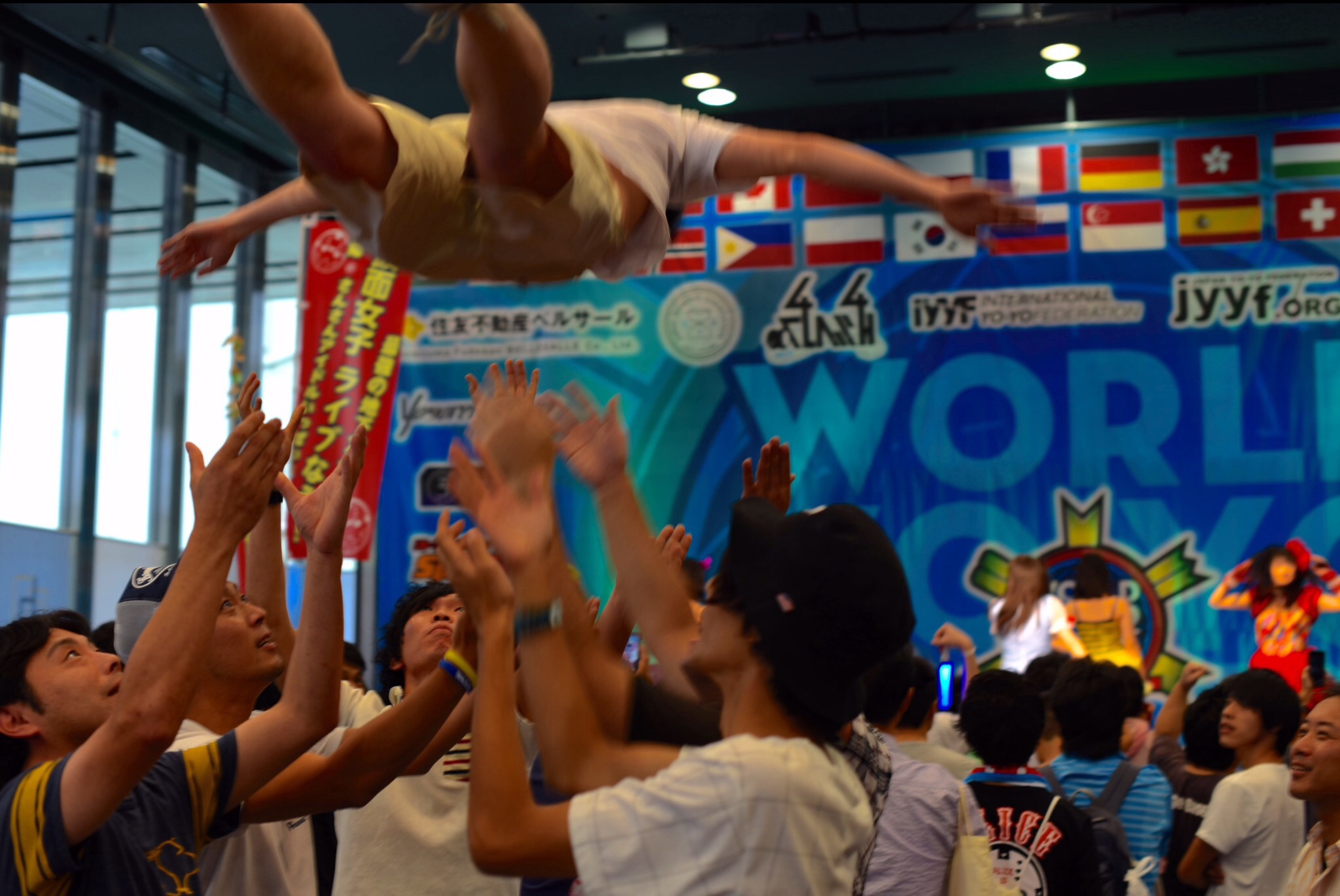 A Guy getting tossed into the air as the crowd goes wild for AKB48, Akihabara, Japan