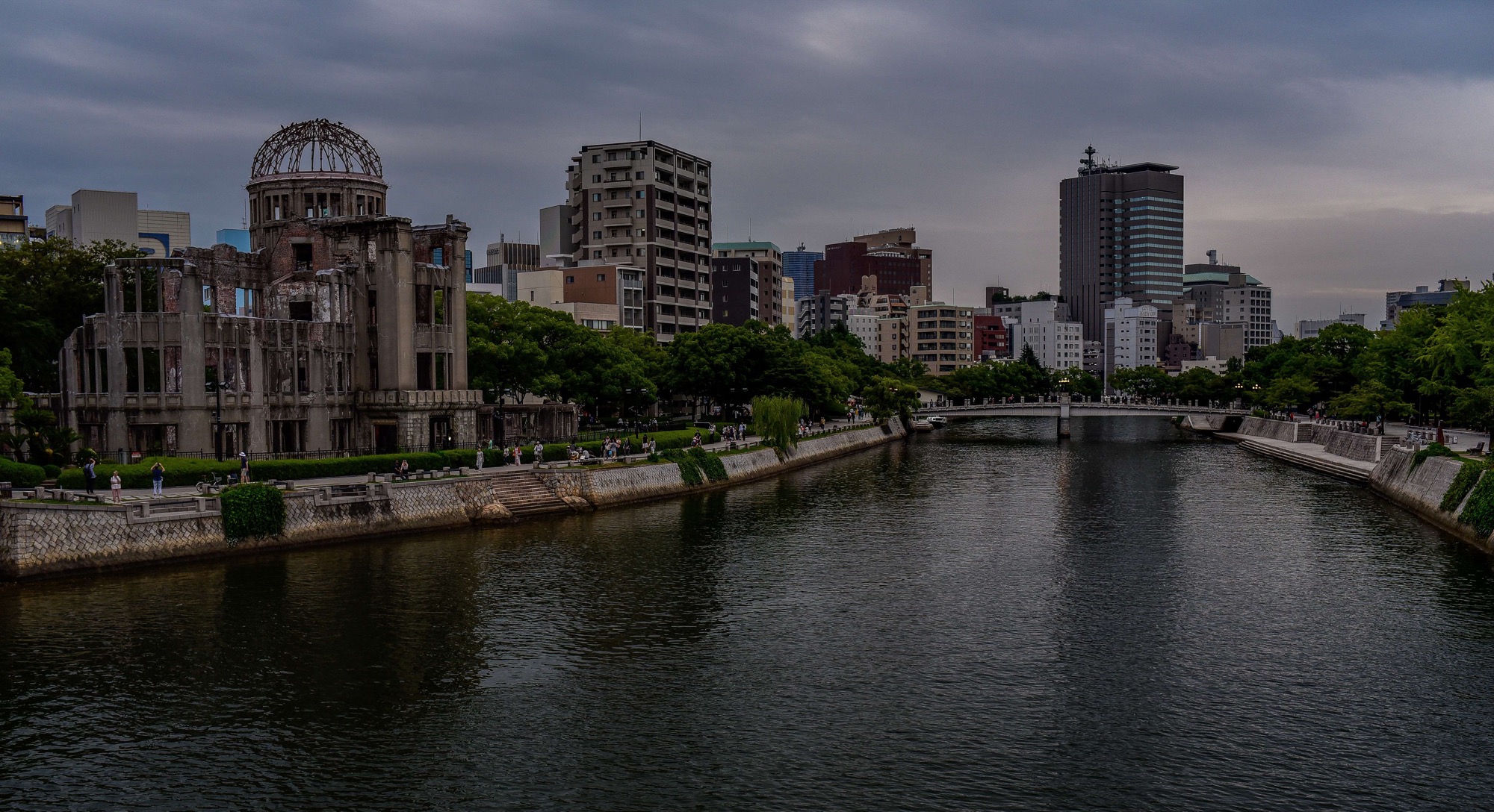 The A-Dome (left) which is a building that survived as you see it from the blast. Everyone inside died instantly. The photo was taken from the bridge which was the target. Hiroshima.